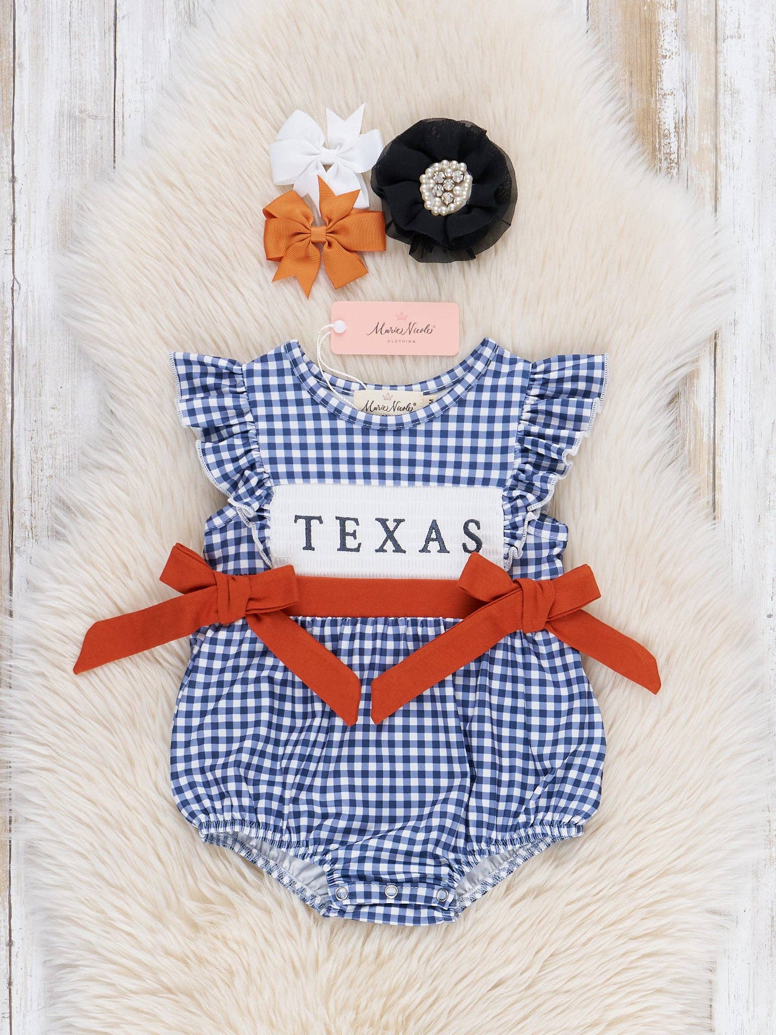 The Texas Smocked Gingham Bubble mixes playful style with spirited team pride for your little one. This charming romper features a timeless blue and white gingham pattern, flutter sleeves, and a smocked front with “Texas” embroidered. It’s soft, lightweight, and snaps make changing quick and simple.