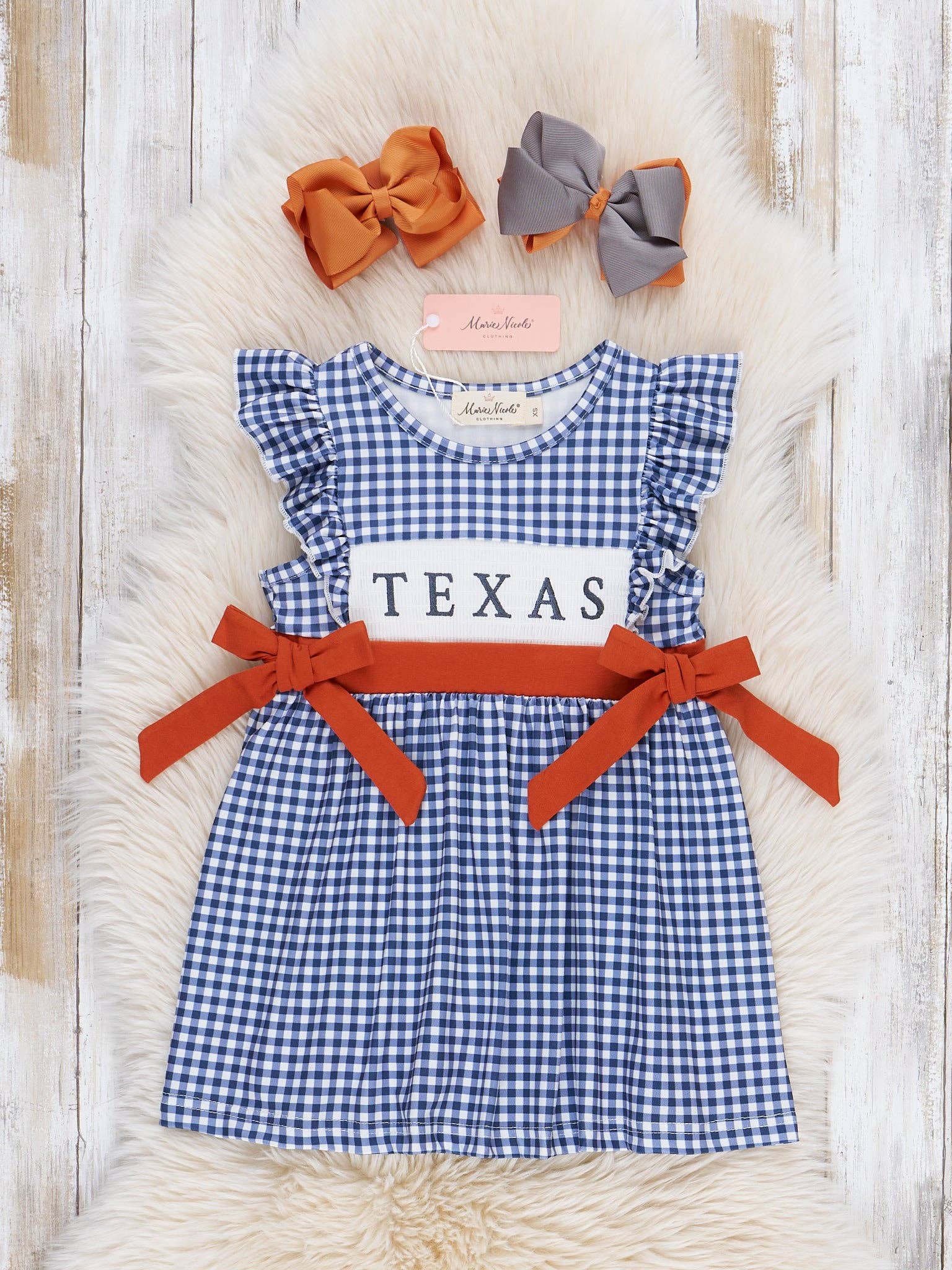 The Texas Smocked Gingham Dress blends Southern charm with team pride. With its timeless blue and white gingham, cute ruffle sleeves, and a smocked “Texas” patch, it’s an adorable choice for game days!